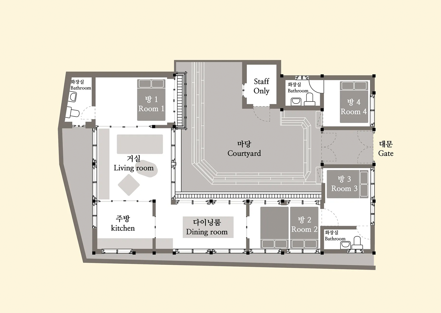 / 한지와 목재를 중심으로 구성된 창성동 한옥은 전통에서 모티브를 얻되, 간결하고 모던한 터치로 머무는 분께 따뜻하고 편안한 울림을 전합니다. 각각의 가구와 오브제는 기능을 넘어 의미와 미감을 담아낸 정교한 큐레이션의 결과물입니다.