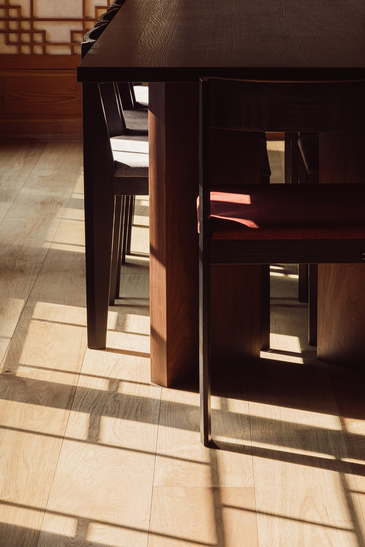 목재의 깊은 결을 살린, 메스감이 도드라지는 10인용 대형 테이블과 체어는 공간에 힘과 중심을 부여합니다. 대범하고 묵직한 테이블과 대조적으로, 양정모 작가의 라운드 펜던트 램프는 공간에 부드러운 균형을 더하며, 창가를 따라 흐르는 소미당의 한지 커튼은 빛의 결을 따라 유려한 리듬을 만들어냅니다.
