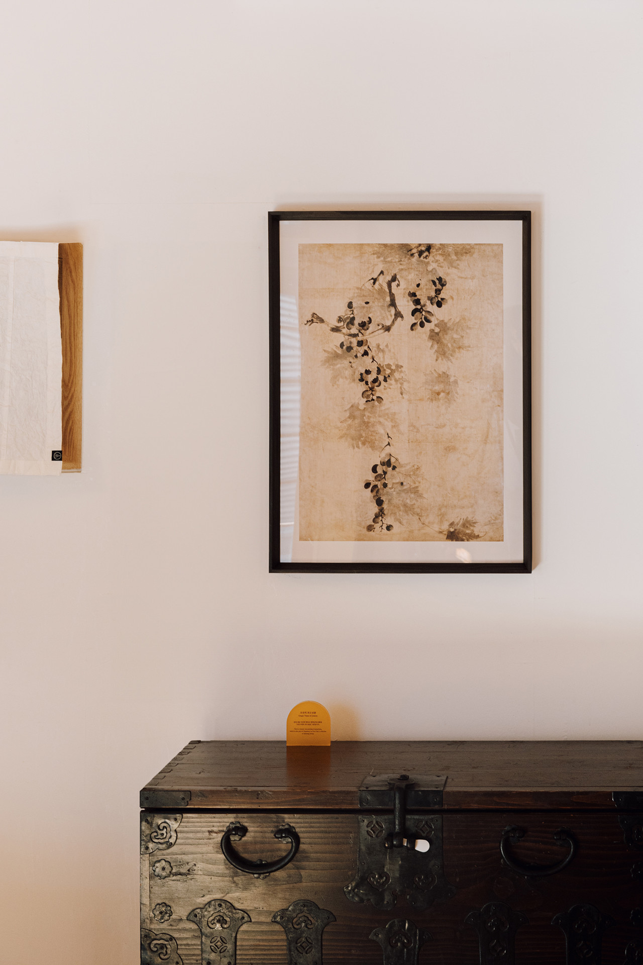 다이닝 공간 한켠에 놓인 전통 반닫이와 이건희 컬렉션에 포함된 조선의 포도넝쿨 민화는 고요하고 절제된 클래식함을 더하며, 전통과 현대의 조화로운 미학을 완성합니다.