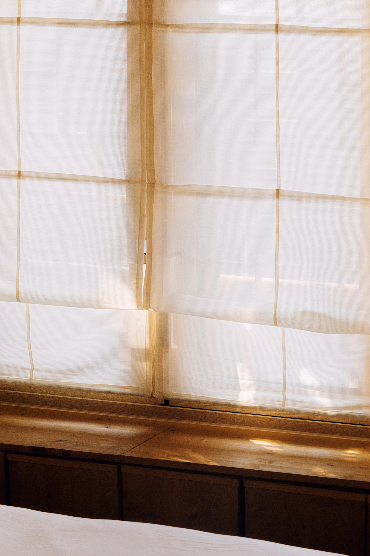 가장 큰 침실에는 우화의 전통 방식으로 제작된 요 토퍼가 준비되어 있어, 아이와 함께 머물기에도 편안한 구성을 갖추었습니다. 벽면에는 벼루를 형상화한 오늑의 벽걸이형 옷걸이와 절제된 선이 돋보이는 벤치가 자리하며, 소지품을 간결하게 보관하실 수 있습니다. 창문에 걸린 소미당의 한지 패브릭과 블라인드는 자연광을 은은하고 따뜻하게 받아냅니다.